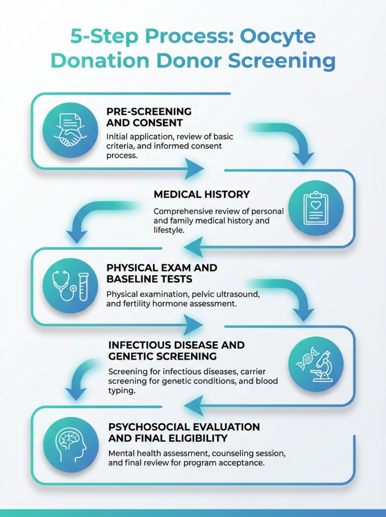 This infographic outlines the five-step screening process for oocyte donors. It highlights eligibility checks, testing, consent, and ethical considerations.