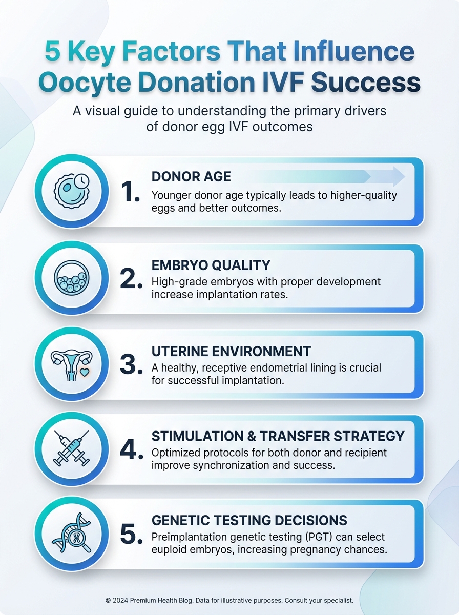 This infographic highlights the five key factors that influence oocyte donation IVF success and how they affect outcomes. Use it to contextualize success rates when discussing options with a clinic.