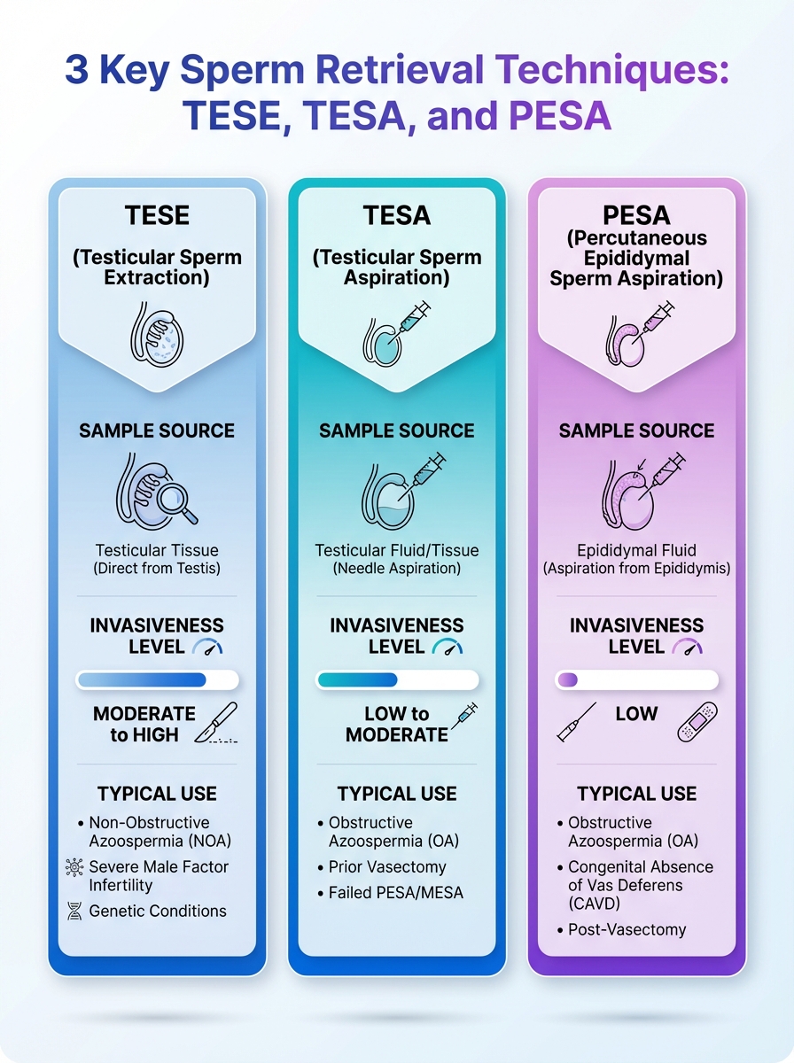 An at-a-glance guide to TESE, TESA, and PESA sperm retrieval techniques. Learn how each method is used in male fertility treatment.